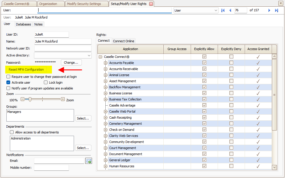 The Multi-factor Authentication feature is included in the 2023.11 release. It's for application administrators and IT administrators who may need to reset the MFA configuration for a user.