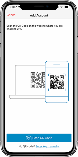 Follow the instructions for the authenticator application that you have selected to add a new account. When the authenticator application asks for the QR code, scan the QR code that displays on your computer screen.