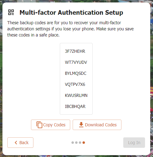 If you ever lose the device with the authenticator app, you can use a backup code (recovery code) instead of a code generated by the authenticator app. Copy the codes or download the codes and store them in a safe place.