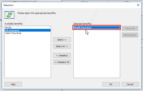 Use the Selection form to remove all benefits except for the health insurance benefit, and then click OK.